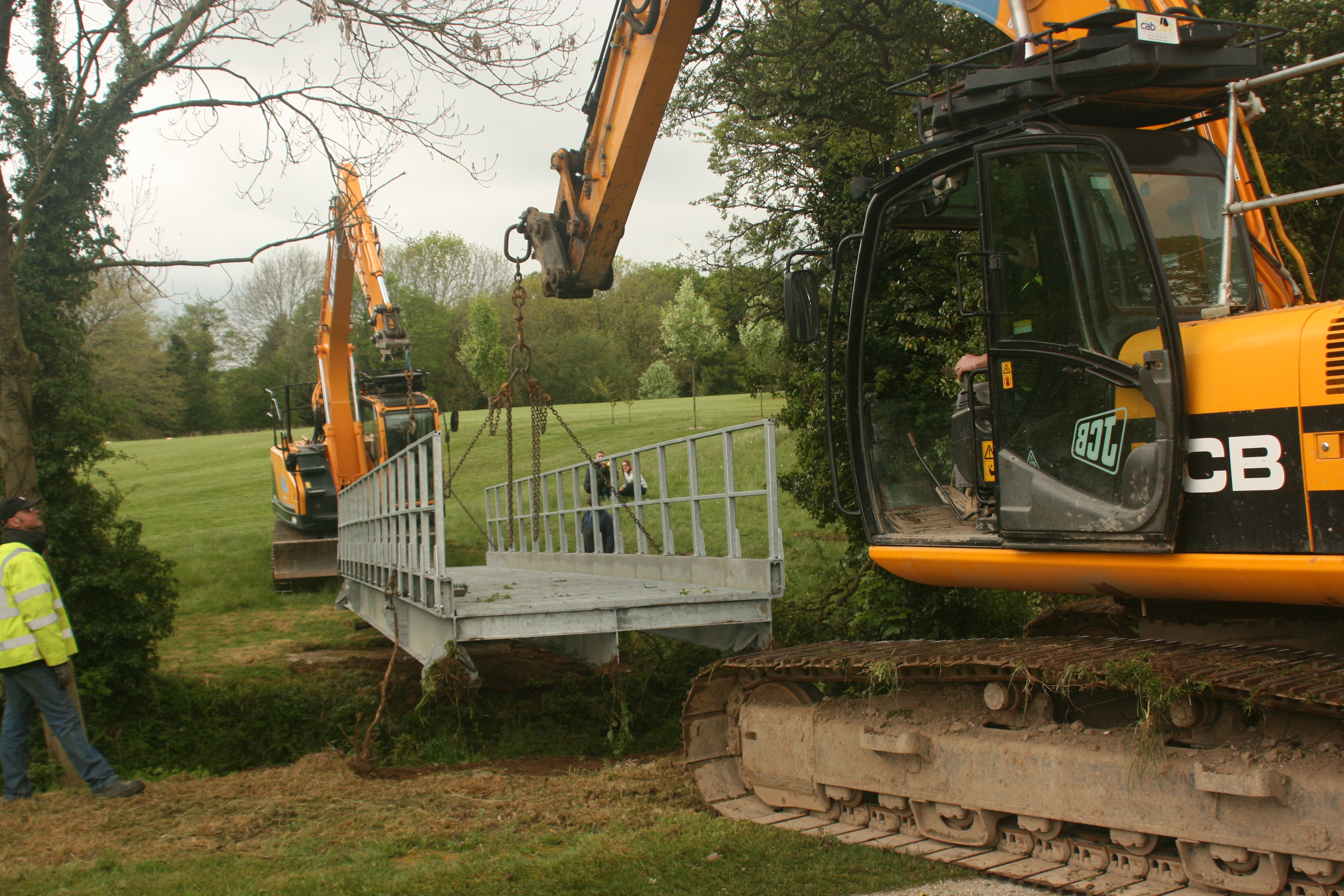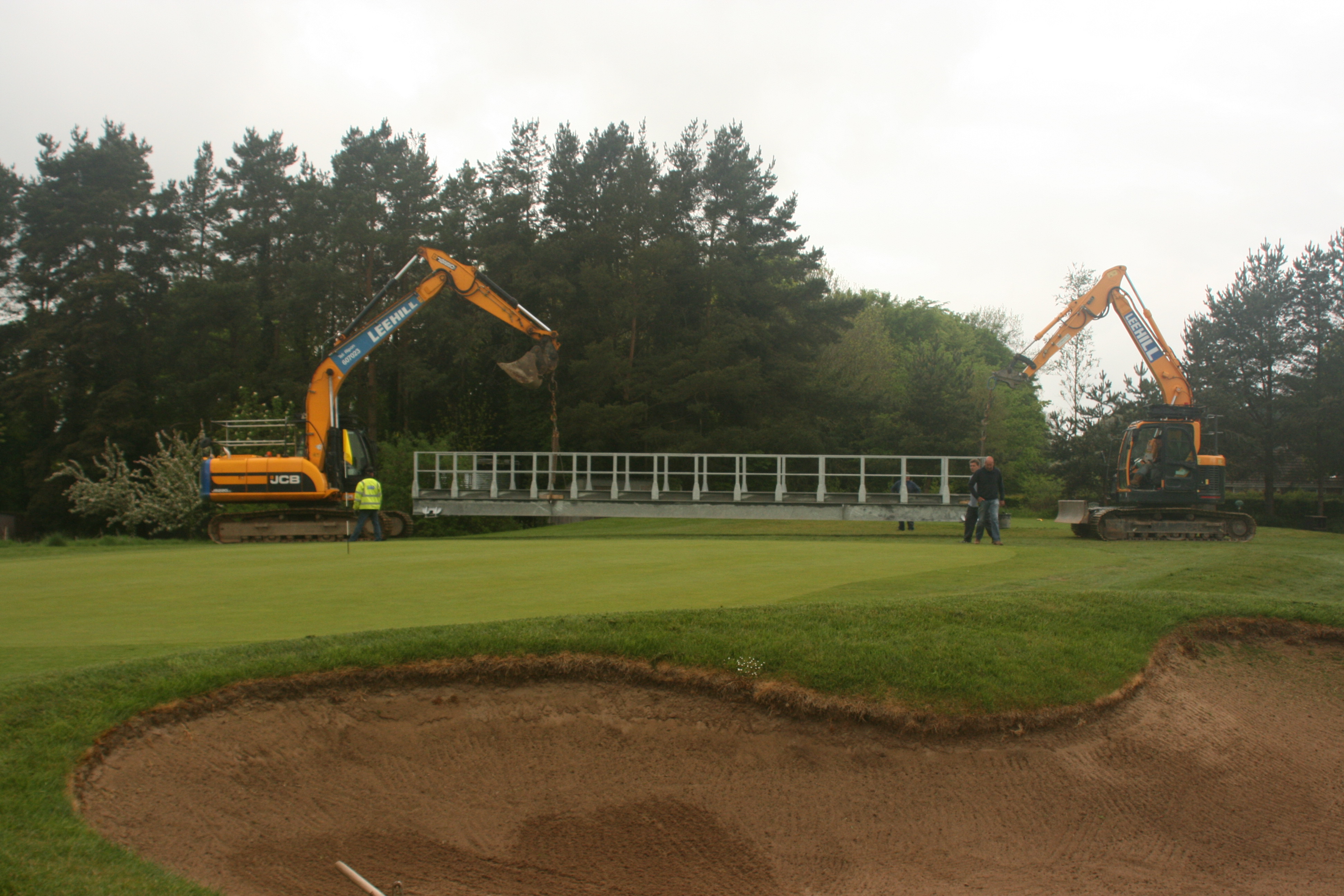 Ripon based firm LEEHILL Construction assisted their local golf club by installing a new bridge which was kindly donated by members. The bridge weighing 6.2 tonnes and spanning 15 metres, was tandem lifted into place using two hydraulic excavators.